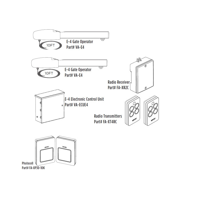 he new E-4™ Residential Swing Gate Operator leads the industry in being the best, most cost effective residential linear arm actuator. This new design allows for a maximum gate capacity of 850 lbs/10’ or 550 lbs/16'. Featuring a convenient manual release handle and pre-wiring for an easy and quick installation. It is ready to be powered with low voltage wiring, allowing installation versatility and accuracy. The E-4™ offers a 2 year residential warranty and UL compliance.